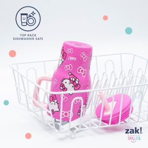 The 16-ounce Hello Kitty tumbler is made of durable stainless steel. with vacuum insulation that keeps drinks fresh and cool while stopping condensation and water rings. It has a silicone straw that’s comfortable to sip from. as well as sealed to the lid to help prevent splashes and spills. When you’re on the go. the handle gives you a secure grip and the tumbler fits in most car cup holders. making travel easy and convenient. And at the end of the day. the durable stainless steel straw tumbler is top rack dishwasher safe for easy cleanup! Use it with kids age 3 and up for cold drinks only. and do not microwave.
