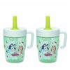 The 16-ounce Bluey tumbler is made of durable stainless steel. with vacuum insulation that keeps drinks fresh and cool while stopping condensation and water rings. It has a silicone straw that’s comfortable to sip from. as well as sealed to the lid to help prevent splashes and spills. When you’re on the go. the handle gives you a secure grip and the tumbler fits in most car cup holders. making travel easy and convenient. And at the end of the day. the durable stainless steel straw tumbler is top rack dishwasher safe for easy cleanup! Use it with kids age 3 and up for cold drinks only. and do not microwave.