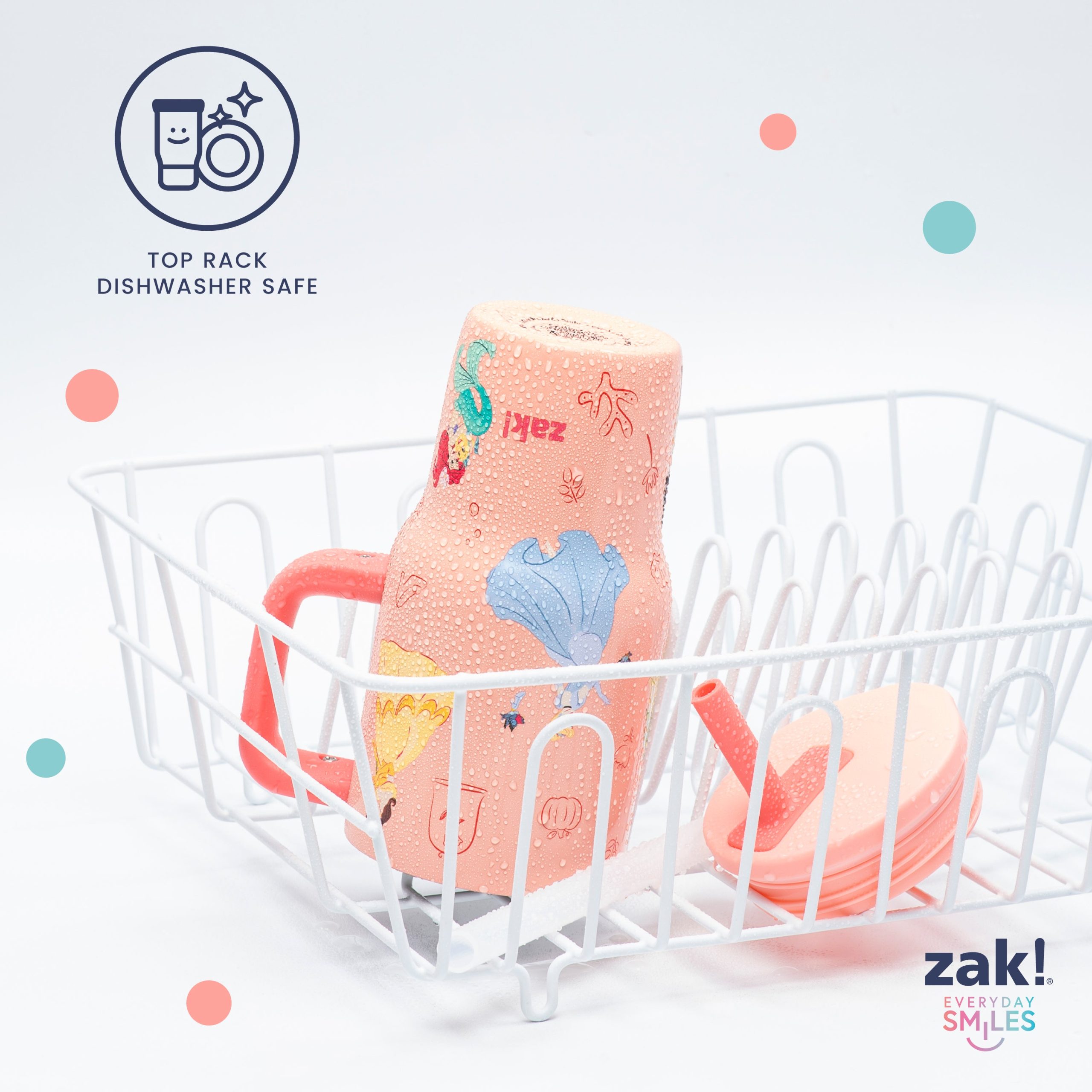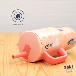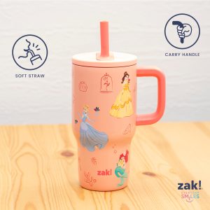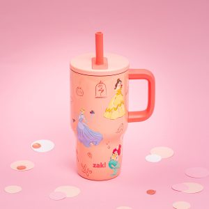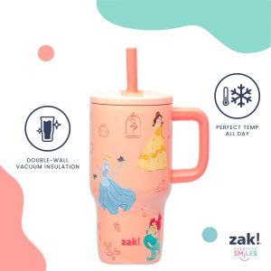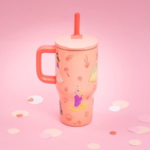 The 16-ounce Disney Princess tumbler is made of durable stainless steel. with vacuum insulation that keeps drinks fresh and cool while stopping condensation and water rings. It has a silicone straw that’s comfortable to sip from. as well as sealed to the lid to help prevent splashes and spills. When you’re on the go. the handle gives you a secure grip and the tumbler fits in most car cup holders. making travel easy and convenient. And at the end of the day. the durable stainless steel straw tumbler is top rack dishwasher safe for easy cleanup! Use it with kids age 3 and up for cold drinks only. and do not microwave.