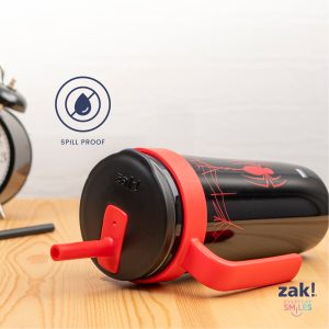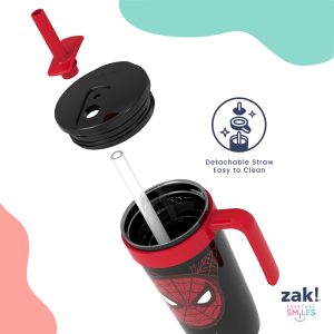 The 18-ounce Marvel Spider-Man tumbler is made of durable stainless steel. with vacuum insulation that keeps drinks fresh and cool while stopping condensation and water rings. It has a silicone straw that’s comfortable to sip from. as well as sealed to the lid to help prevent splashes and spills. When you’re on the go. the handle gives you a secure grip and the tumbler fits in most car cup holders. making travel easy and convenient. And at the end of the day. the durable stainless steel straw tumbler is top rack dishwasher safe for easy cleanup! Use it with cold drinks only and do not microwave.