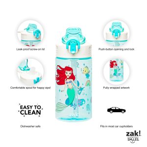The 16-ounce Disney Princess water bottle is made of plastic. durable enough for kids to use every day and bring on any adventure. The lid screws on securely and won’t leak when the spout is closed. though water flows for easy drinking when the spout is open. It’s easy to release for quick access. and the button has a flip-up lock to keep it from activating accidentally. The drinking bottle fits in most car cup holders with a built-in carrying loop on the lid for easy transportation. and with the cover to keep the spout clean and closed. it can be tossed into a bag for worry-free travel.